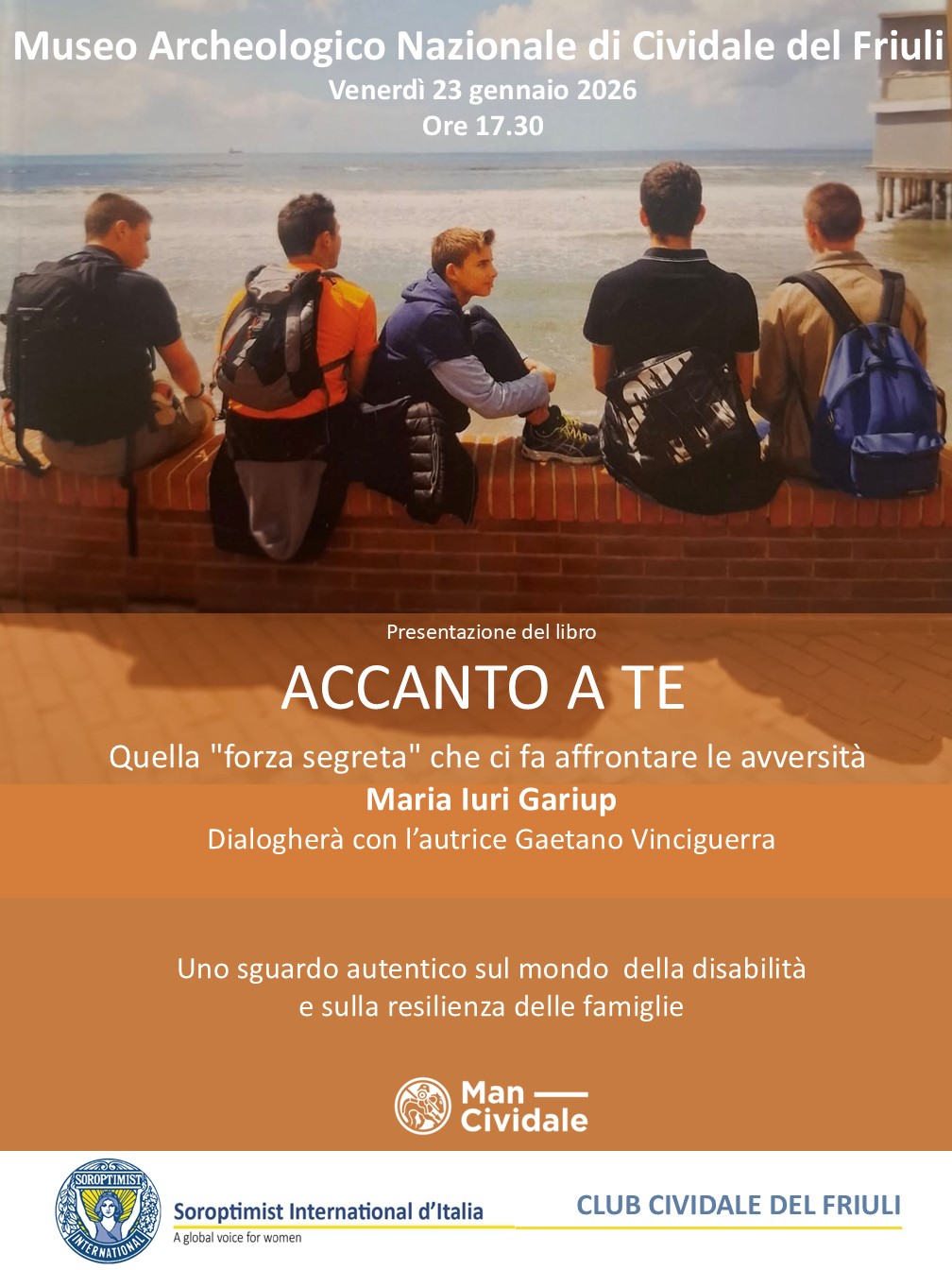 Ore 17.00 presentazione del libro Accanto a te. Quella “forza segreta” che ci fa affrontare le avversità, di Maria Iuri Gariup. Storia di grande coraggio e determinazione, uno sguardo autentico sul mondo della disabilità e sulla resilienza delle famiglie.